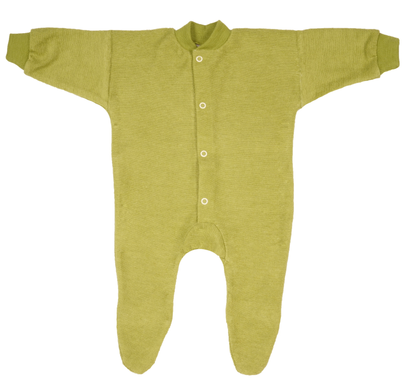 Overall aus reiner Wolle aus kontrolliert biologischer Tierhaltung, mit Fuß und langen Armen. Die Beinchen sind unten zu, hält die Füsse auch schön warm. Am Hals und an den Armen sind weiche, fein gestrickte Bündchen angenäht. Druckknöpfe verschließen diesen wolligen Overall. Der Woll-Frottee Schlafanzug sorgt dafür, dass das Kind warm bleibt ohne zu schwitzen.