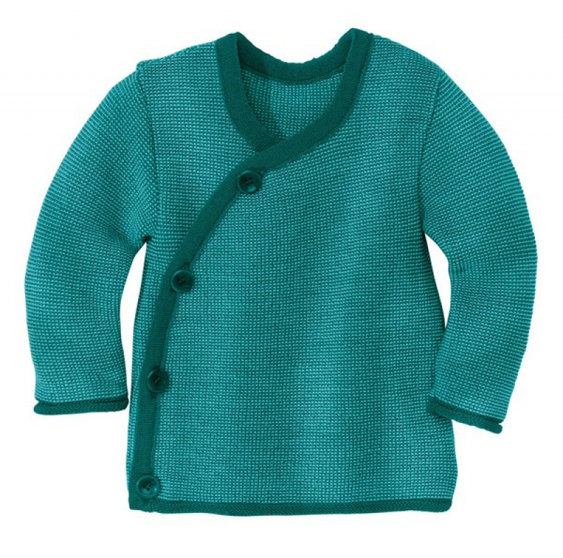 Wickeljacke oder Wickelpullover, beides ist möglich. Der schöne Pullover ist aus reiner Wolle aus kontrolliert biologischer Tierhaltung. Dank des Wickelverschlusses auf der Vorderseite, ist die Jacke auch am liegenden Kind ganz einfach anzuziehen. Steinnussknöpfe außen und ein Bindeband auf der Innenseite sorgen für sicheren Verschluss. So drückt auch bei Bauchlage, beim Robben oder beim Spielen kein Knopf.